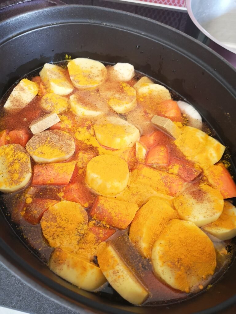 Les légumes vont cuire 3 à 4h dans la cocotte à feu moyen. Il faut que ça glougloutte doucement. Comme c’est coupé gros, le bouillon aux épices va infuser la surface des légumes. Mais l’intérieur aura toujours le goût du légume.