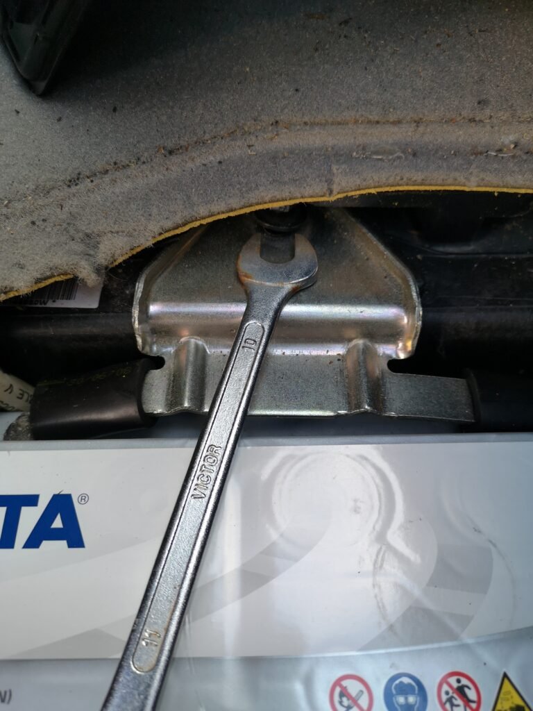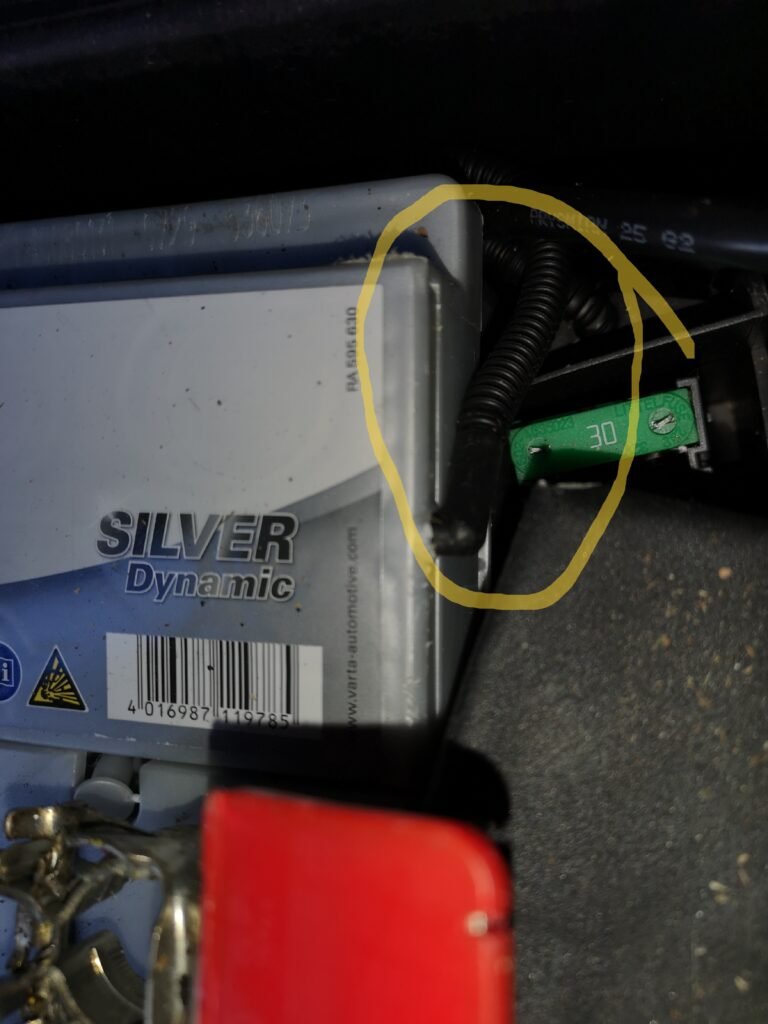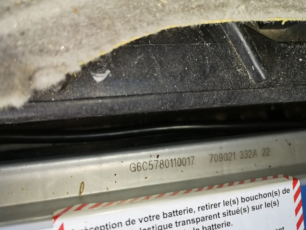 Après, c’est le moment technique. L’emplacement est très étroit et il y a des câbles, la grosse cosse rouge et des fusibles qui passent à droite. Le bas de la batterie a un petit rebord qui ne facilite pas le passage. J’ai aussi un bout de plastique sous le tapis passager qui bloque un peu. Je l’ai coupé légèrement avec une pince coupante pour pouvoir me faciliter la vie. Je me demande si ce plastique ne s’est pas décalé avec le temps. Il faut donc à la fois forcer et utiliser de la douceur pour extraire la batterie. En tirant un peu vers la droite, vers le haut, le bas, successivement. Ça fait les muscles car elle est assez lourde !